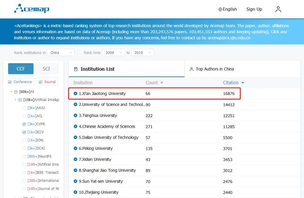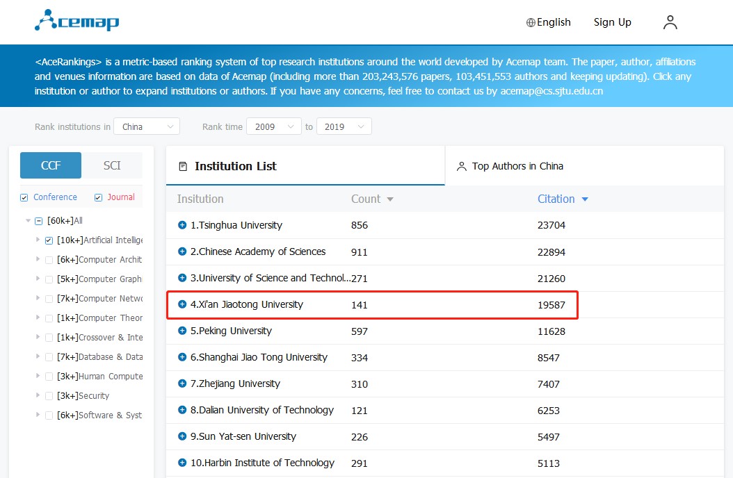 近日,上海交大Acemap团队开发了全球顶级研究机构排名系统AceRankings,该排名系统根据中国计算机学会(CCF)推荐的A类会议和期刊上发表论文的引用量,对中美Top 50的研究机构和相关学者进行了排名。我校在2009至2019年十年间论文引用量位居全国研究机构第五名,进入前五名的机构还包括:清华大学、中国科学院、中国科技大学和北京大学。