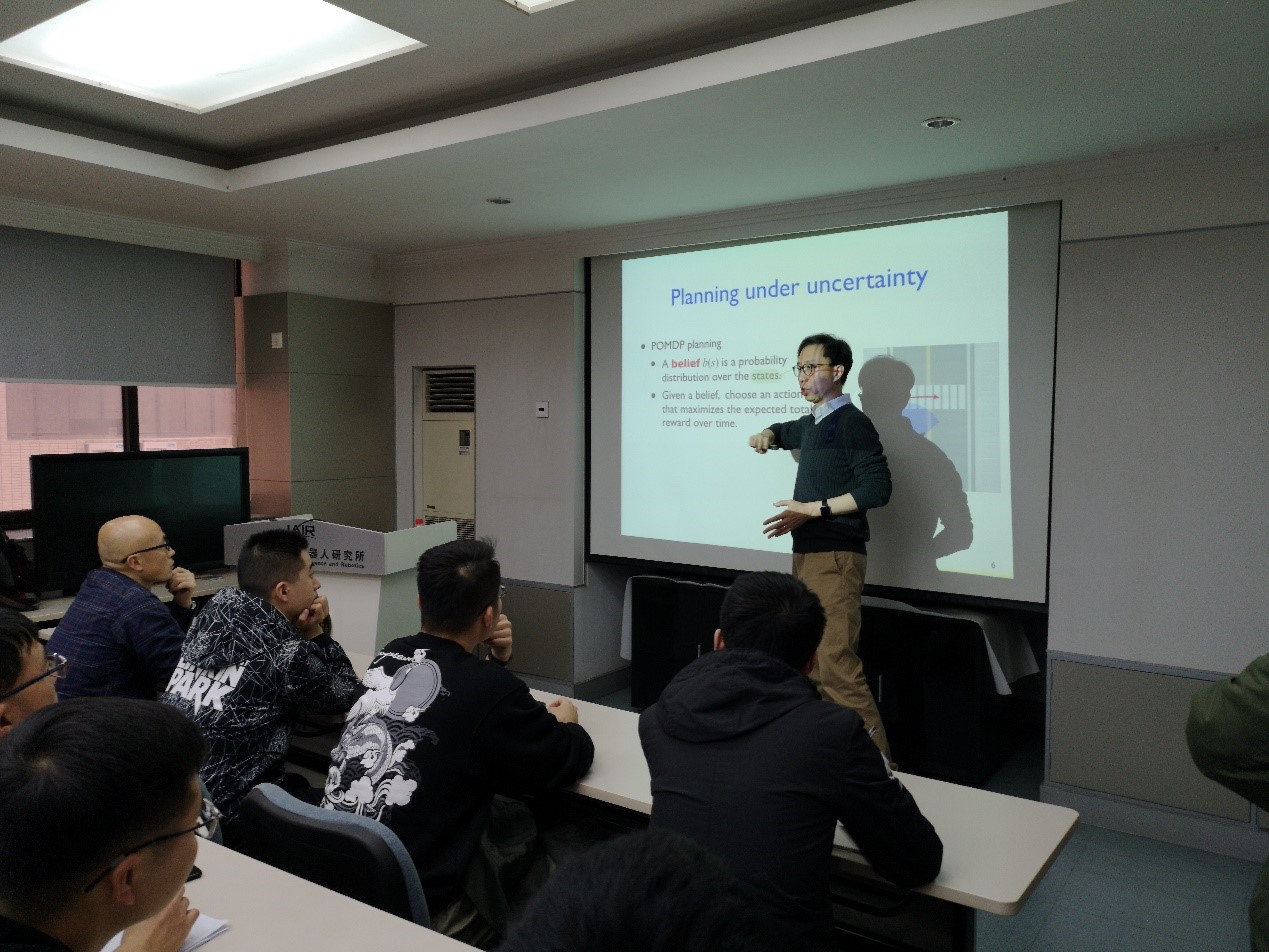 报告的主要内容为在不确定环境下机器人决策。David教授介绍了基于POMDP模型下的环境不确定性建模过程,及如何结合无模型学习和基于模型的规划完成决策任务,并通过用一组参数化的可优化策略完成模型的建立和对策略进行端到端的训练,获取最终的决策结果。
