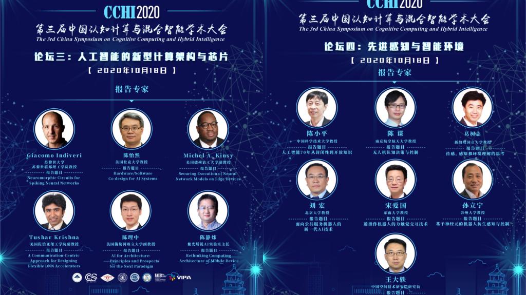 大会共设立了四个论坛,主要围绕混合智能、知识表达与推理、统计学习与深度学习、计算机视觉、智能机器人、人工智能新型计算架构与芯片、自主智能系统与无人驾驶等主题,邀请了来自国内外知名大学、研究所和科技公司的25位知名学者和专家做论坛报告。其中,其中17日上午的“论坛一:认知计算的基础理论”共6个报告,17日下午的“论坛二:混合增强智能与深度学习”共6个报告,18日上午的“论坛三:受神经科学启发的计算架构与器件”共6个报告,18日下午的“论坛四:先进感知与智能环境”共7个报告。600余人线上聆听了会议。