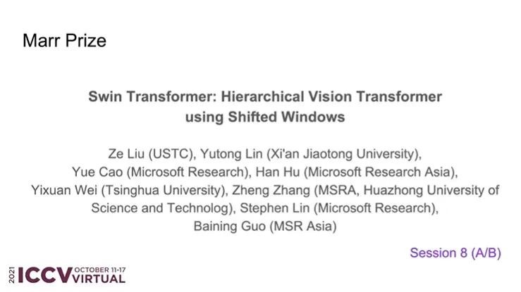 本次ICCV2021的最佳论文奖(马尔奖)颁发给了来自中国科学技术大学的刘泽、西安交通大学的林宇桐、微软亚洲研究院的曹越、胡瀚等研究员共同合作的Swin Transformer: Hierarchical Vision Transformer using Shifted Windows。这篇论文“提出了名为Swin Transformer的新型视觉Transformer,它可以用作计算机视觉的通用骨干网络”,这也是该论文的获奖理由。