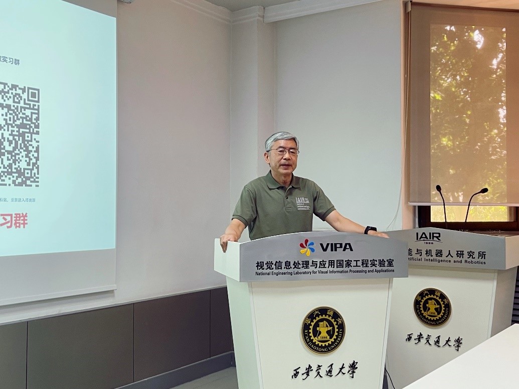 最后,郑南宁教授回忆起自己本科阶段实习的经历。郑老师讲到当年实习前兴奋的心情与同学们相似。大学生专业实习是走向社会、了解社会的一个重要阶段,通过实习将理论知识与实践相融合,进一步巩固、深化已经学过的理论知识,运用所学过的知识培养自己发现问题、解决问题的能力。同时郑老师谈到,数据、算法、算力、作为AI核心三要素,相互影响、相互支撑,在不同行业中形成了不一样的产业形态,希望同学们通过专业实习感受AI应用的奇妙。