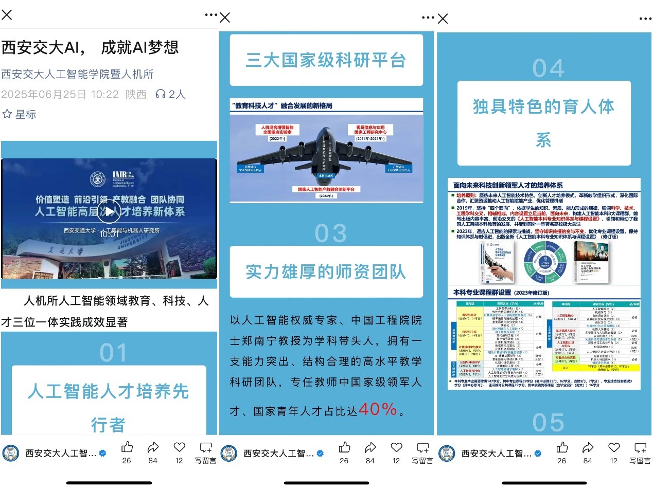 威廉希尔中国官网充分发挥新媒体传播优势,扩大招生传播力度,学院官方微信公众号精心策划推出"西安交大AI,成就AI梦想"系列专题,通过图文推送、视频展示等多种形式,多维度、立体化地展现人工智能专业特色。