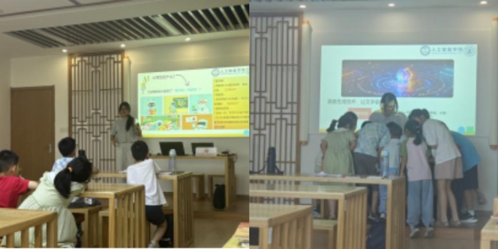 随后实践团队们来到苏州市虎丘区枫桥街道西津桥社区新时代文明实践站,为暑托班的30余名学生开展了一场主题为《启智未来,AI温暖相伴》的科普课程。主讲人张佳倩巧妙运用漫画和故事,串联起人工智能发展的历史脉络,通过结合生活中的例子,让孩子们理解了本身晦涩难懂的知识。这正是因为开讲前实践队员张佳倩和陈欣唯提前搜集了大量材料,为的就是AI相关知识能够更好的适应现阶段孩子们的思维模式。并在互动体验环节,张佳倩带着孩子们体验了多模态大模型应用,用AI模仿自己的声音、创造歌曲;给“钢铁侠”“小哪吒”换上了不同的面孔。最后孩子们也在陈欣唯的引导下,认真学习了使用AI的安全规范。孩子们收获的不仅是新奇的知识,更在互动中亲身感受到了科技的温度与力量。