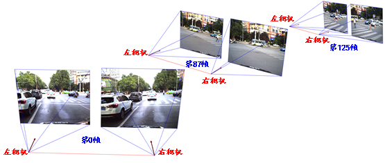 本数据集均采自车辆行驶过程中利用车载立体视觉系统在真实道路交通环境中采集的实际交通场景图像序列,如图三所示。三维场景重建数据库中的三维场景重建需要将基于立体视觉所得每帧的深度信息统一到一个三维坐标系下,其中对于左右相机每帧的位姿估计精度很大程度上决定了三维场景重建的精度,所以三维场景重建采用图三所示左右相机每帧的三维位置估计精度作为评价指标。环境深度感知数据库中的环境深度感知则考察如图四所示三维空间中指定目标物体到左相机的每帧动态距离估计精度。